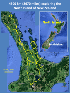 Above: exploration summary – 4300 km of driving (2670 mi) in the North Island; 309,550 walking steps while visiting Auckland (i.e. according to our wrist-portable step-counter), nearby and distant cities/towns, their museums and monuments, national parks and protected areas (in other words, about 155 km or 96 mi by foot)!