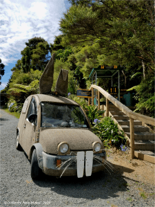 Above: this was our transportation — every time we rent a car, they give us a bright color one. This time was red. Last time (in Vancouver), a bright blue large truck almost impossible to park. In any event, can you spot the rooster and the hen? There are somewhere in the photo. Highway 1 North, an hour away from Auckland