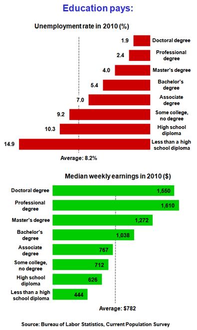 Figure above: Education Pays: Unemployment and Median Weekly Earnings as Function of Education — Bureau of Labor Statistics — © 2011.