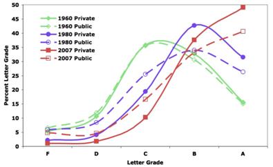 Figure above: National average grading curves as a function of time, 1960, 1980, and 2007 for public and private schools — Rojstaczer & Healy– Teachers College Record © 2010.