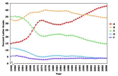 Figure above: Where A Is Ordinary: The Evolution of American College and University Grading 1940-2009 — Distribution of grades at American colleges and universities as a function of time— Rojstaczer & Healy — Teachers College Record © 2010.