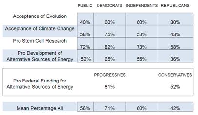 Above: Views about evolution, climate change, stem cell research, and alternative sources of energy by the American public, registered democrats, independents and republicans. Sources: Evolution: Gallup Poll 2007, Climate Change: Gallup Poll 2012; Stem Cell Research: Harris Interactive 2010; Alternative Sources of Energy: Pew Research Center 2012.