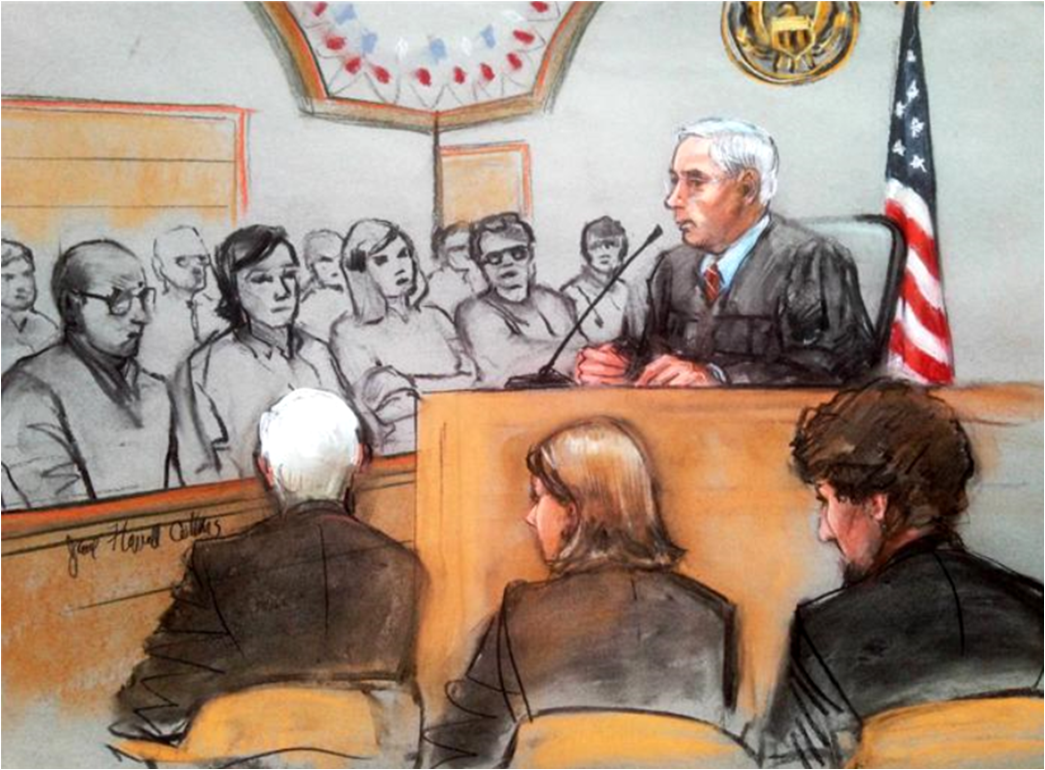 Judge George O’Toole speaks during the penalty phase of the trial of convicted Boston Marathon bomber Dzhokhar Tsarnaev – Illustration by Jane Flavell Collins – Boston com
