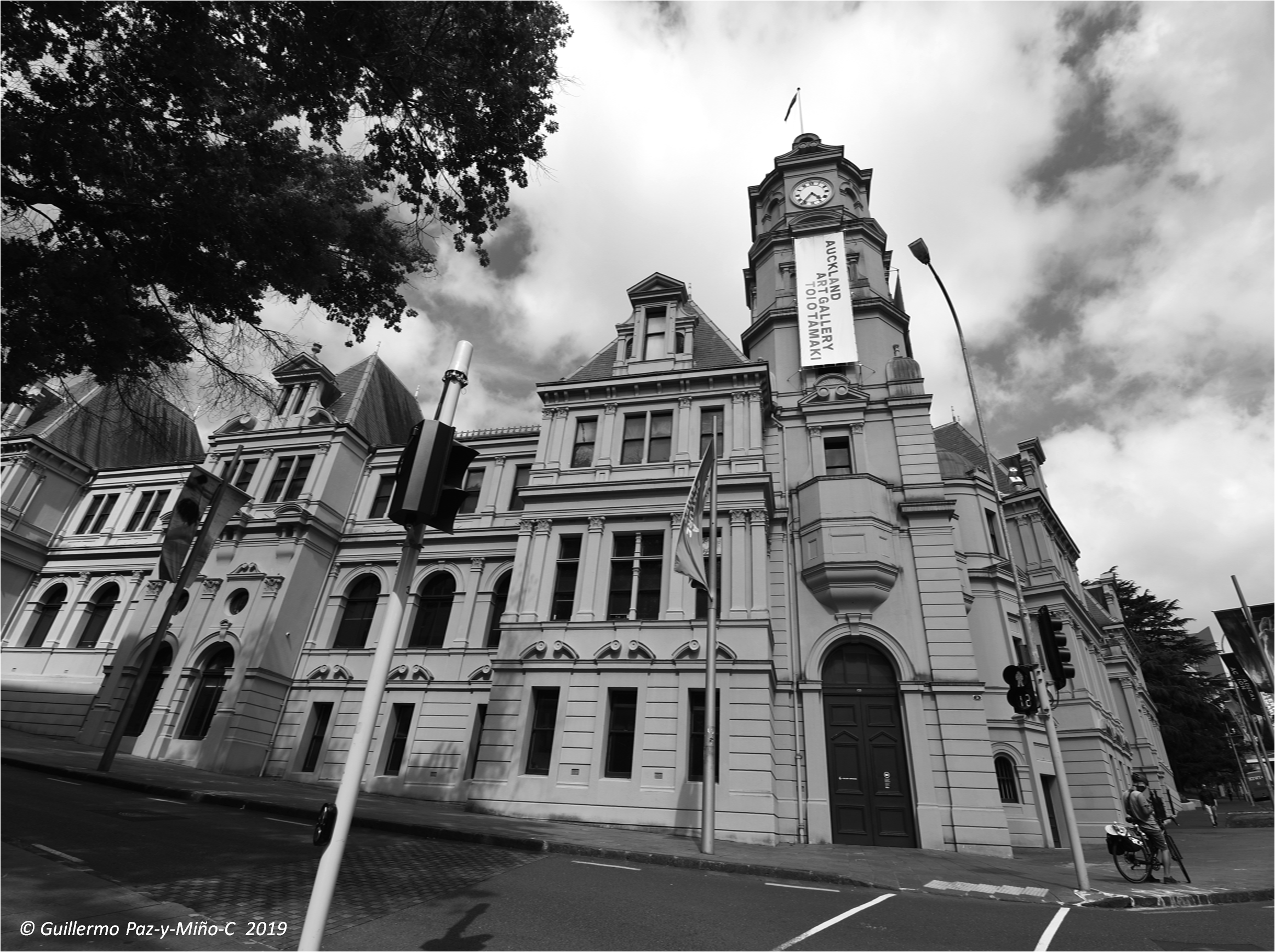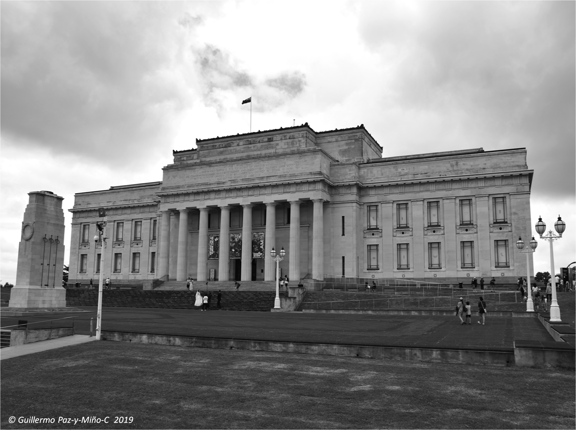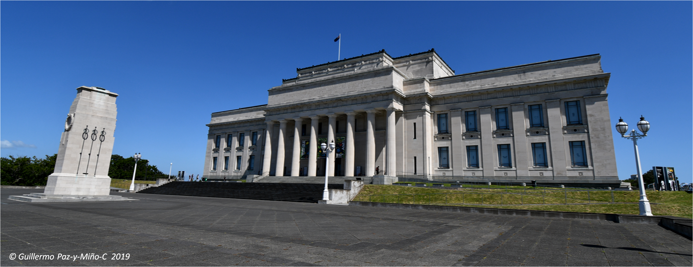 Above: some time for a panoramic of the Auckland Museum [its actual name is Auckland War Memorial Museum, but the exhibits are not restricted to war or related memories; in fact, the most impressive aspect of the museum is its collection of Maori and Pacific artifacts, spectacular]