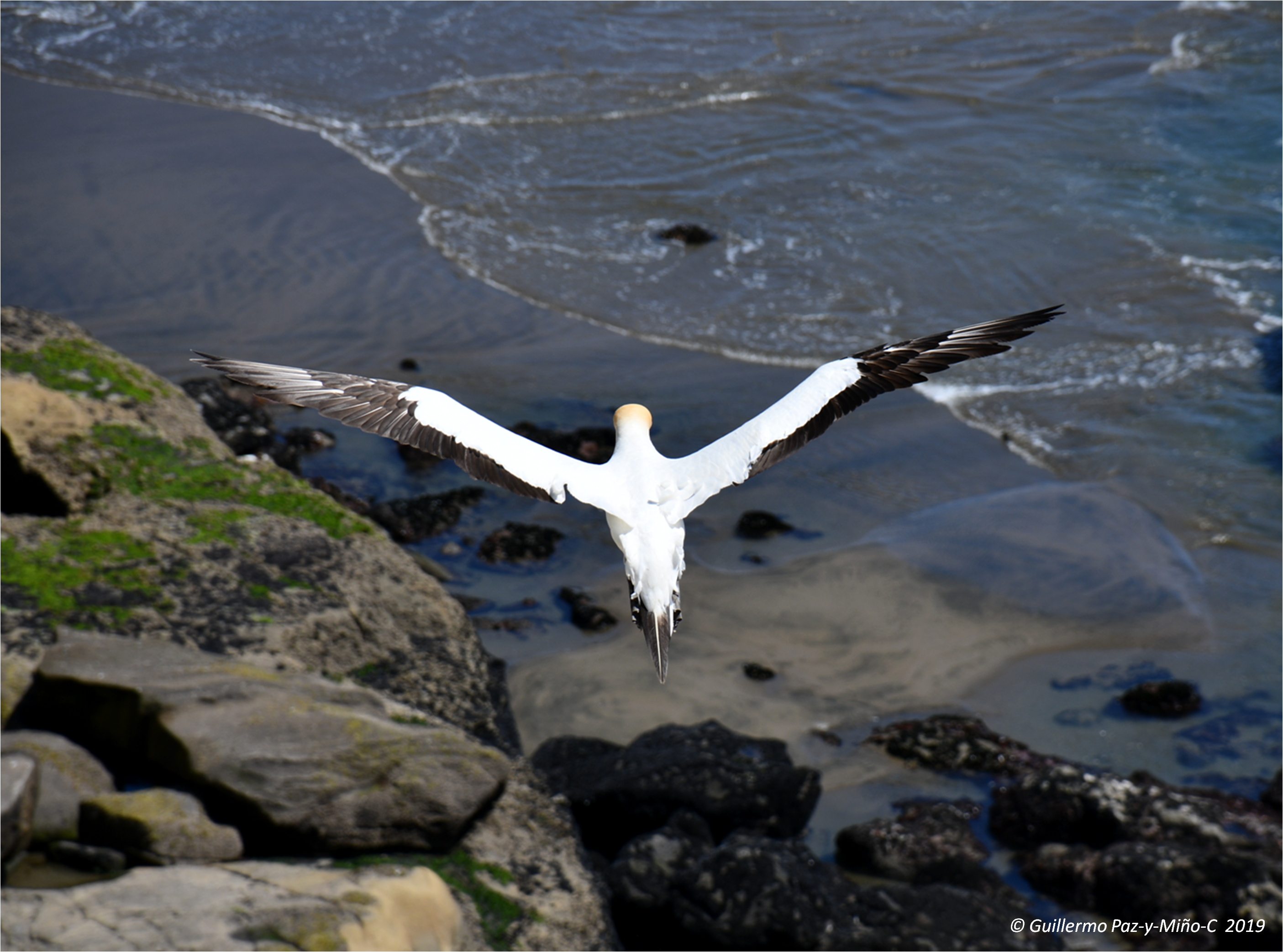 Above: Colony of Australasian gannets on top… one is taking off. Tasman Sea
