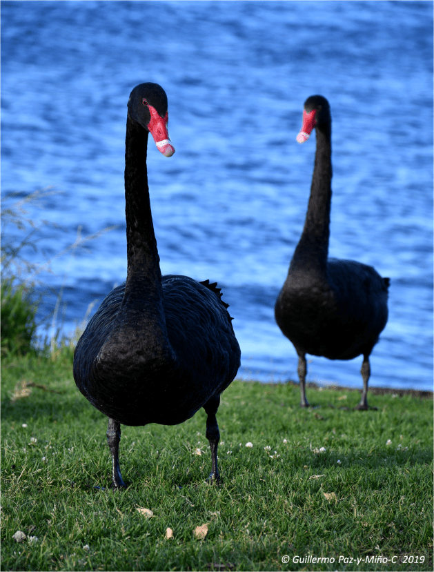 Above: we found these black swans at Lake Taupō… male and female. They had five offspring with them, almost adult size; the parents were ready to defend them (i.e. charge) if anybody got too close…