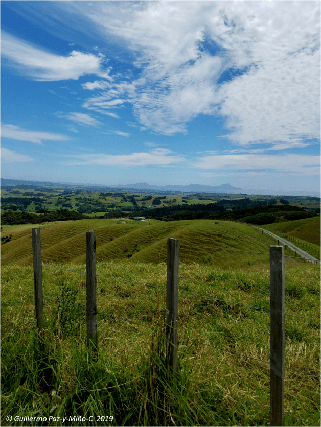Above: a view of the Bream Head [little peninsula in the back] from nearby Ruakaka, Highway 1 North; about an hour and a half from Auckland – BTW natural colors; the NZ sky is that blue and the landscape that green. – NZ is beautiful