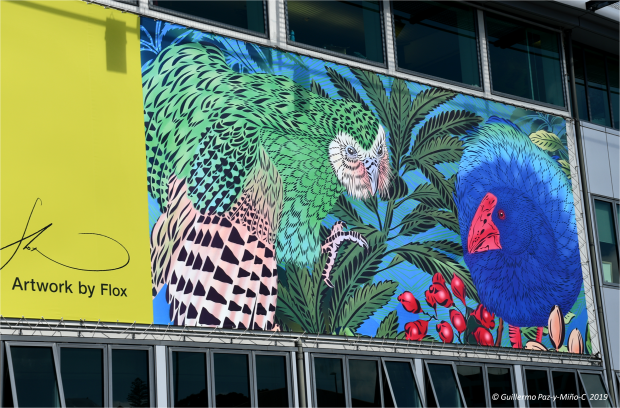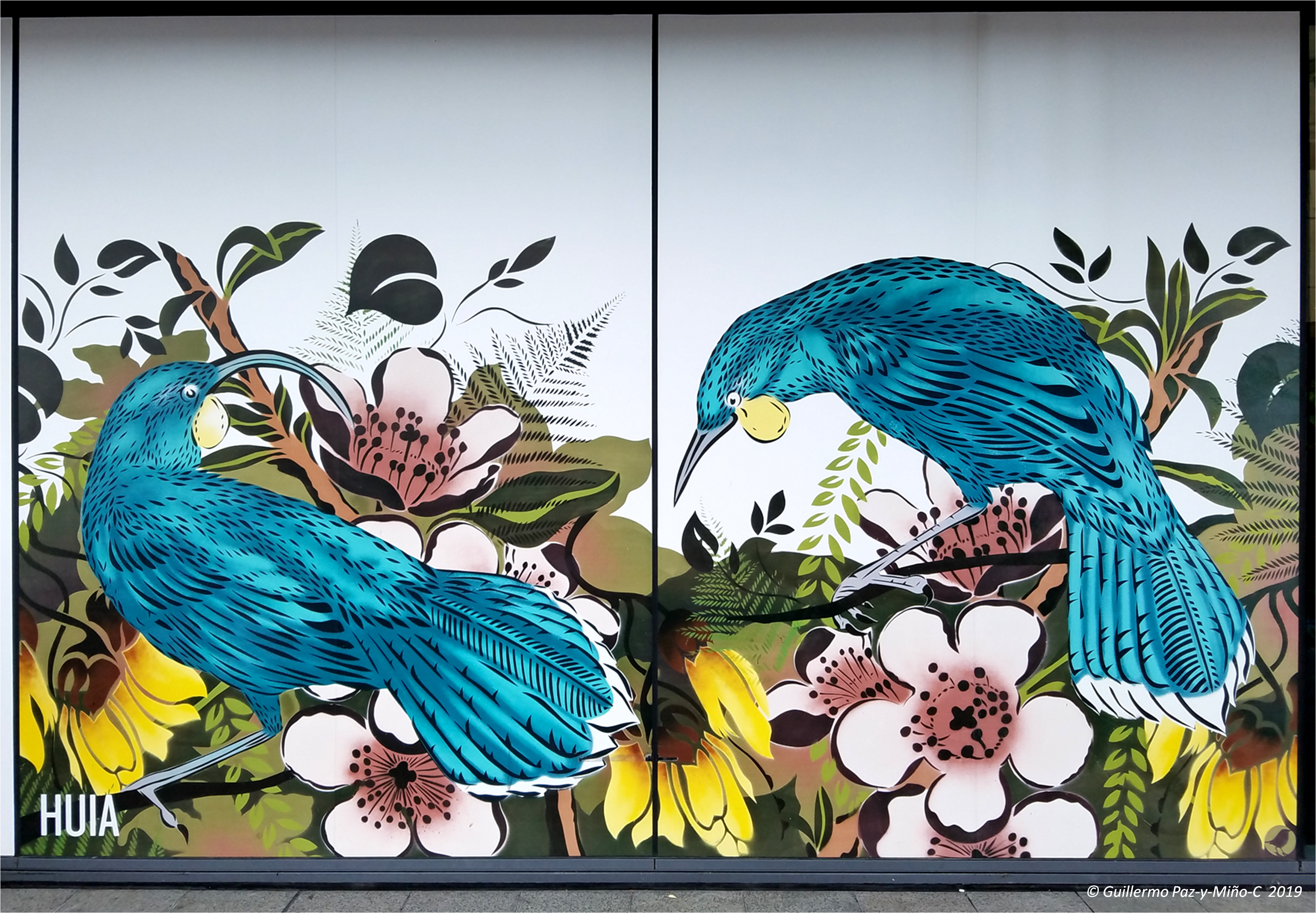 Above: The Huia, male (left) and female (right). Now extinct, the bird was common in the North Island of New Zealand. There are some unconfirmed reports of its existence. – We found this beautiful art (about 3×5 meters; 9×15 ft) in the streets of Auckland