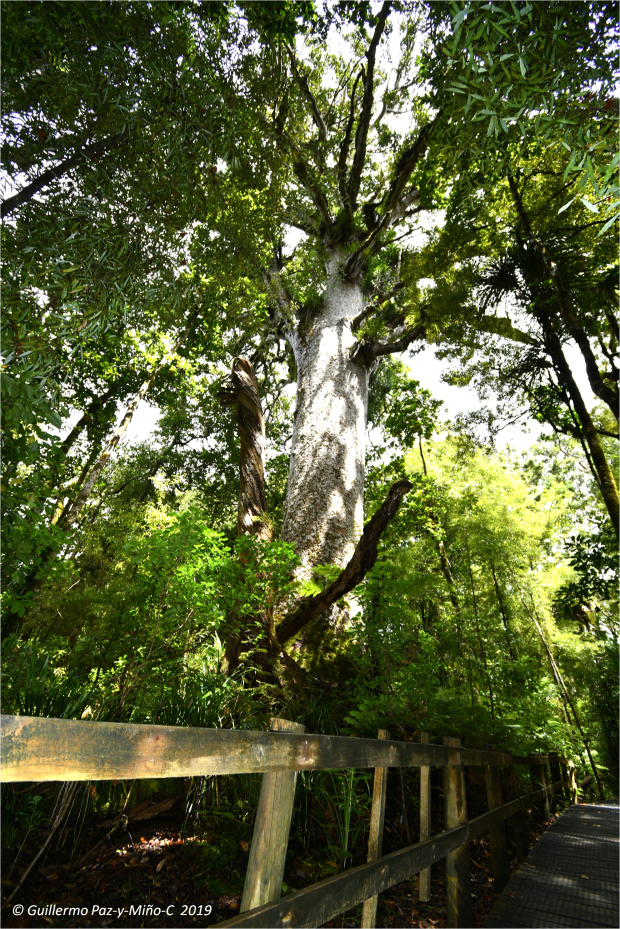 Above: Kauri tree, 7-m diameter, Waipoua Forest – we drove 460 km (286 mi) to the Waipoua Kauri Forest, Northwest part of the North Island. It took us four hours (one way) from Auckland to get to the site. Our purpose was to see the gigantic Kauri trees (in the genus Agathis). We did find them. Impressive, enormous (the largest diameter 6-m / 18 ft), majestic