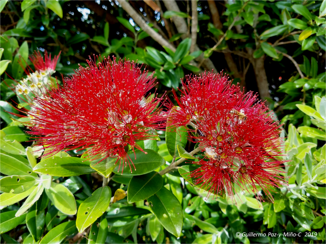 Above: we spotted this “New Zealand Christmas Tree” (quite common btw). It belongs to the genus Metrosideros. – Can you spot the bees? How many?