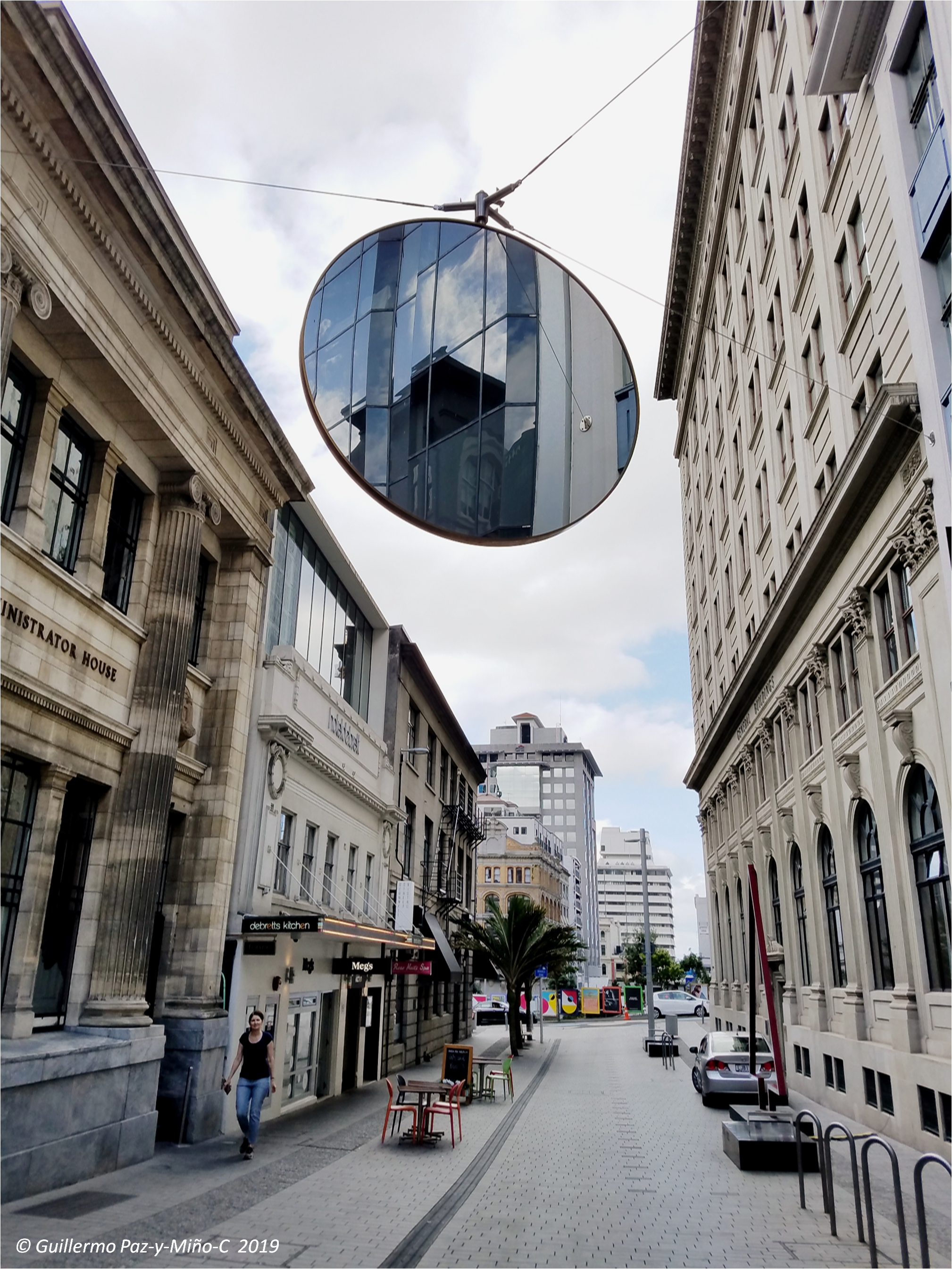 Above: a giant mirror, “Light Weight O” by Catherine Griffiths (2018), reflecting O’Connell Street in Auckland