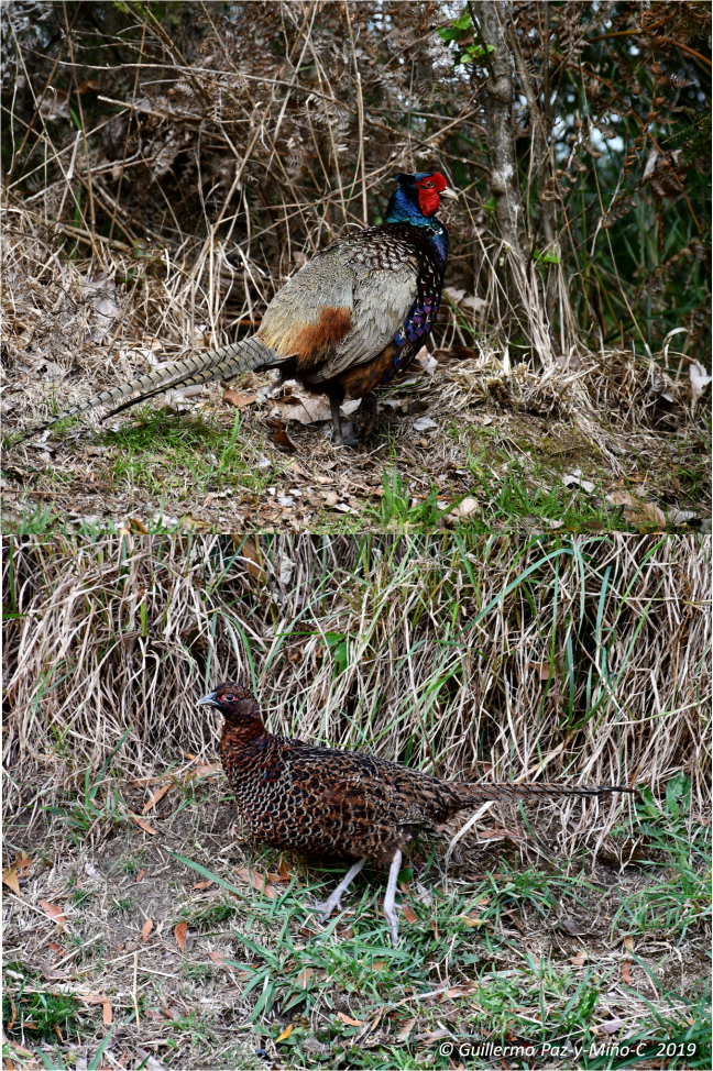 Above: We found these pheasants (M/F) foraging nearby the town of Taupō, North Island, New Zealand [introduced species, of course] – suboptimal to get a shot; they were moving; coming in and out of the bushes; close, but not together to get a single photo; alert, but mostly ignoring us; the male did his usual singing and wing flapping… nature continued