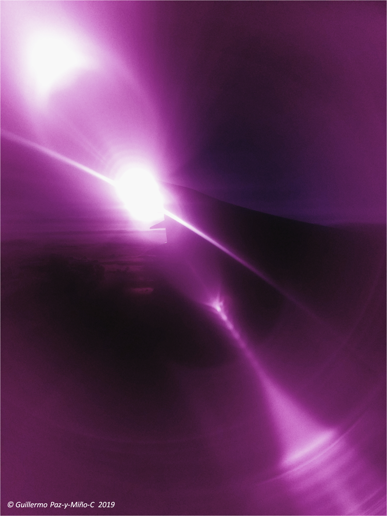 Above: LA to Auckland (13 hours) – middle of the Pacific, through the polarized window of our “modern” plane. We could see the Sun outside (it looked like the moon), but it was “night” inside. Then, quickly, but gently, the “sunrise” effect was controlled from the cockpit to give us the illusion of arriving during the early morning