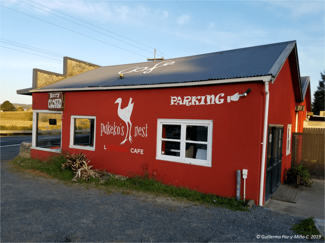 Above: this was our transportation — every time we rent a car, they give us a bright color one. This time was red. Last time (in Vancouver), a bright blue large truck almost impossible to park. In any event, can you spot the rooster and the hen? There are somewhere in the photo. Highway 1 North, an hour away from Auckland