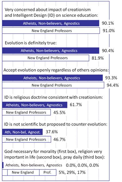 The atheists, non-believers and agnostics who responded to our survey were knowledgeable about the foundations of science, evolution and the public controversy over acceptance of evolution and its teaching in the United States. In Summary Figure 1 (below) we compile some of the relevant findings of this survey and compare atheists’, non-believers’ and agnostics’ responses to those of the highly educated professors of New England (N=244, data from Paz-y-Miño-C. and Espinosa 2011), whose knowledge about science and evolution is the highest nationwide and their religiosity the lowest among US scholars. Note that the figure does not imply that atheists, non-believers and agnostics in our survey have equal training in the sciences as the professors, but simply that in the questions here reported both groups are comparable, except for religiosity which, among atheists, non-believers and agnostics, is 0.0%.