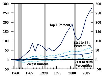 Above: Cumulative Growh in Average After-tax Income, by Income Group (percentage change in income since 1979, adjusted for inflation); source US Congressional Budget Office, CBO Report October 2011