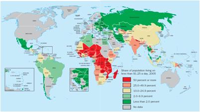 Above: Almost half the world — over three billion people — live on less than $2.50 a day. Source World Bank Development Indicators 2008.