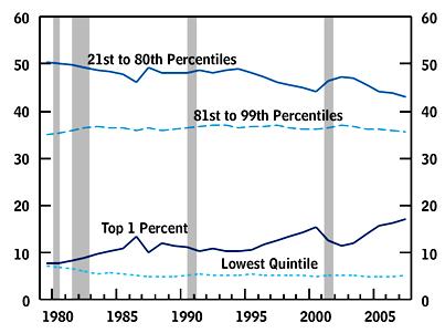 Above: Share of Total After-tax Income, by Income Group (percent); source US Congressional Budget Office, CBO Report October 2011