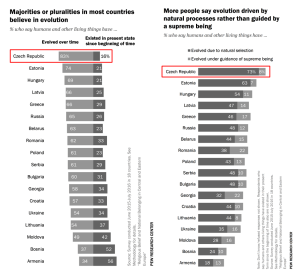 Above: 75% of Czechs favor the separation of church and state (2nd in Central and Eastern Europe, left). And 87% think that it is not necessary to believe in God to be moral and have good values (right).