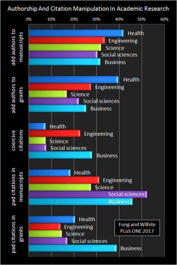 In an article just published in PLoS ONE, December 2017, Eric A. Fong and Allen W. Wilhite, researchers at the University of Alabama in Huntsville, document three practices in academia: (1) the inclusion of “honorary authors” in scientific publications (i.e. the addition of individuals to manuscripts as authors, even though they have contributed little, if anything, to the actual research), (2) coercive citations (i.e. when editors direct authors to add citations to articles from the editors’ journals ‒arguably to boost the journal’s citation index), and (3) padding (i.e. when authors add superfluous citations to a paper in an attempt to increase its chance for publication). Fong and Wilhite surveyed 12,000 scholars from 18 disciplines (i.e. health-care, engineering, science, social sciences and business) at diverse universities in the United States.