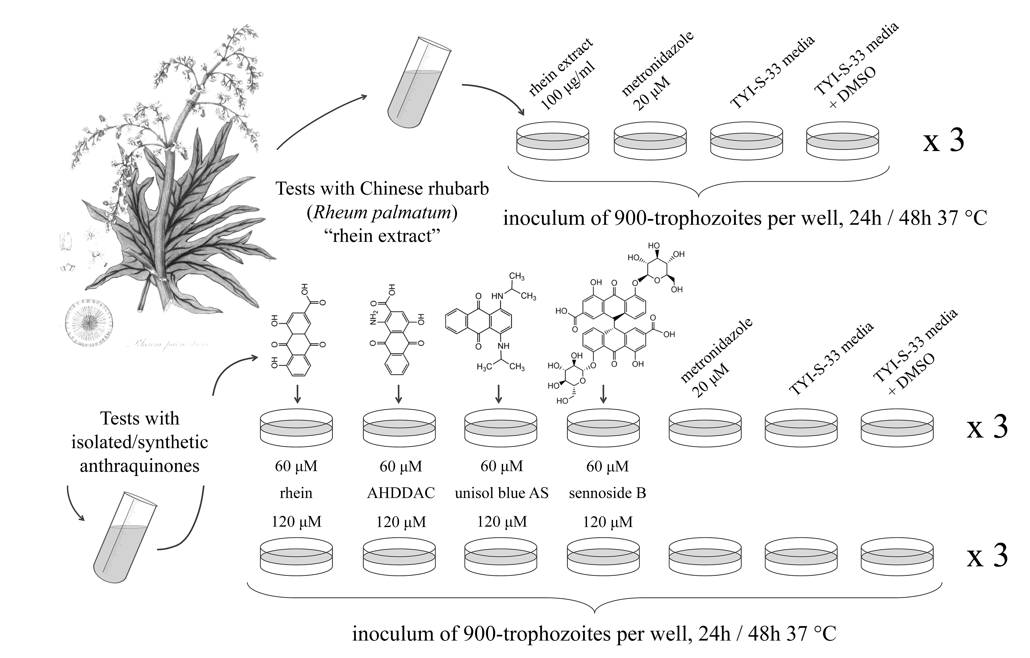 Above (click on image to enlarge) – Experimental design: tests with Chinese rhubarb (Rheum palmatum) extract (“rhein extract”) or with isolated/synthetic anthraquinones. Top: Extract obtained from Chinese rhubarb leaves was added to suspensions of Entamoeba histolytica trophozoites and incubated for 24h or 48 h at 37 °C; likewise, metronidazole (20 μM), TYI-S-33 media or TYI-S-33 media + DMSO (dimethyl sulfoxide) were added to separate suspensions (both controls); each series was done in triplicate (x3, total 24 wells). Bottom: From commercially available isolated/synthetic anthraquinones (rationale in Methods), four analogs (rhein; AHDDAC = 1-amino-4-hydroxy-9, 10-dioxo-9, 10-dihydro-anthracene-2-carboxylic acid; unisol blue AS; or sennoside B) were added (concentrations 60 μM or 120 μM) to the suspensions of trophozoites and incubated for 24h or 48 h at 37 °C; metronidazole, TYI-S-33 media or TYI-S-33 media + DMSO were separately added as in above; each series was done in triplicate (x3, total 84 wells).