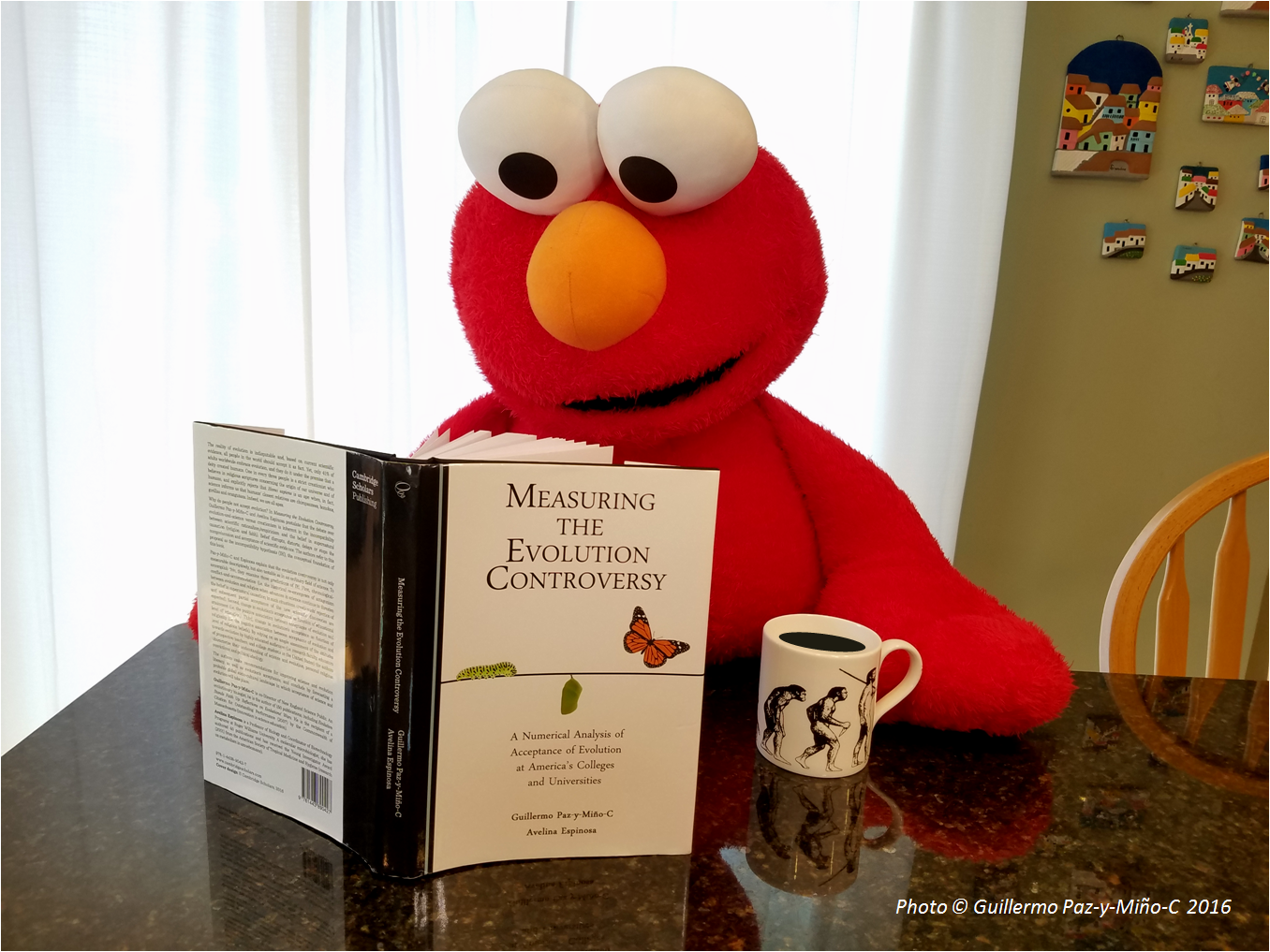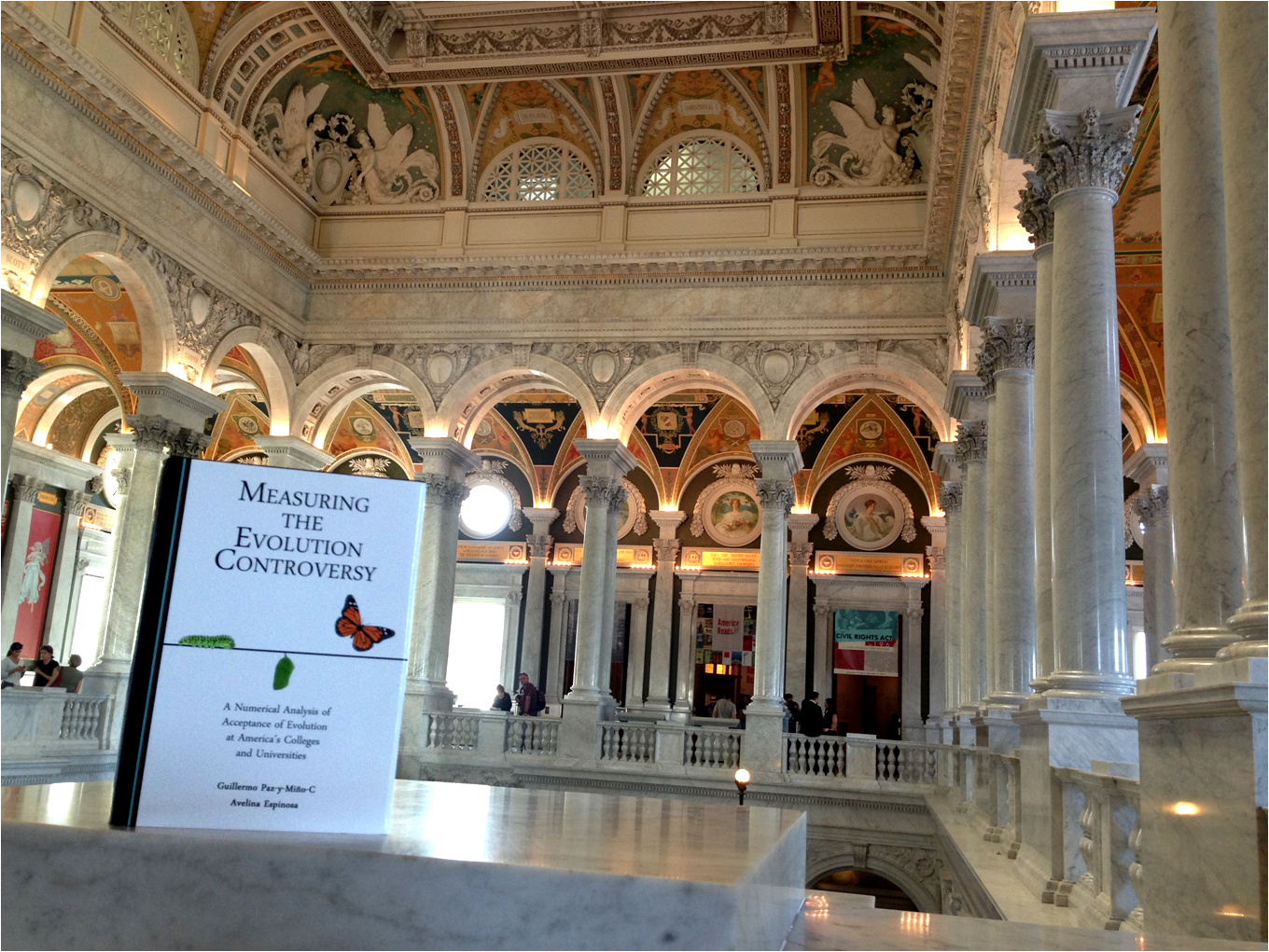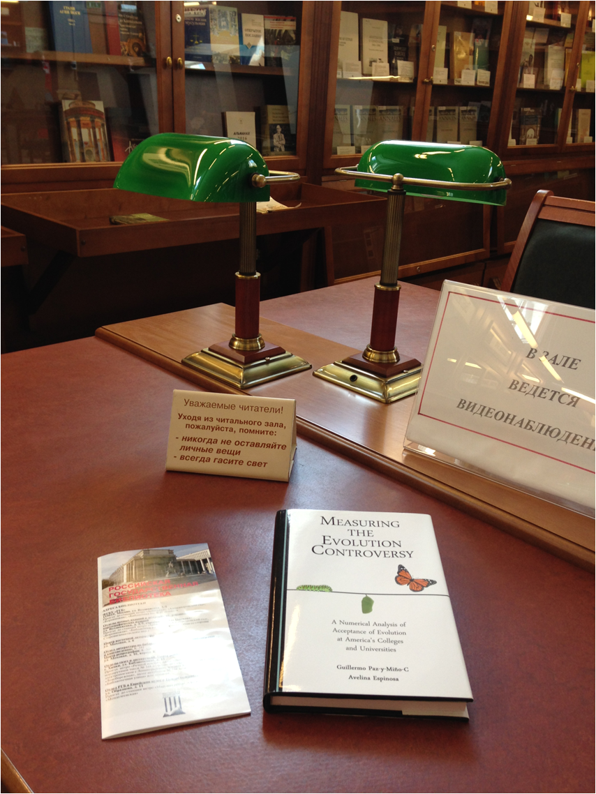 Our 2016 book, Measuring the Evolution Controversy, came out in June (06-01-06) and is now available at 47 major libraries worldwide (hard copy and/or electronic edition). We learned about it via a search on worldcat.org. Here are some selfies of MTEC captured in different settings and cities; we have taken the book out quite a lot. Thus, more than a “book tour,” it has been a tour of the book. The images are shown in no particular order. The last one is our favorite. Enjoy! And best wishes for 2017 to our friends, colleagues and followers — @gpazymino – @EvoLiteracy – Facebook – ResearchGate – Academia.edu.