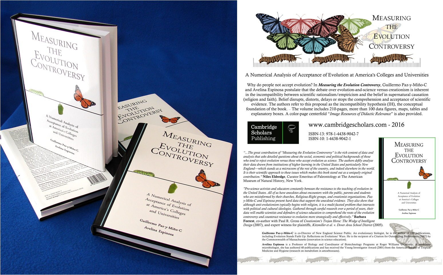Paz-y-Miño-C, G & Espinosa, A. 2016. Measuring the Evolution Controversy: A Numerical Analysis of Acceptance of Evolution at America’s Colleges and Universities. Cambridge Scholars Publishing, Newcastle, United Kingdom. ISBN (10): 1-4438-9042-1, ISBN (13): 978-1-4438-9042-7.
