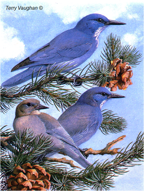 “Pinyon jays seem to work out how to behave towards an unfamiliar jay by watching it in encounters with members of their own flock. The findings provide clues about how cognition evolved in social animals (Shettleworth 2004).” Image left by Terry Vaughan.